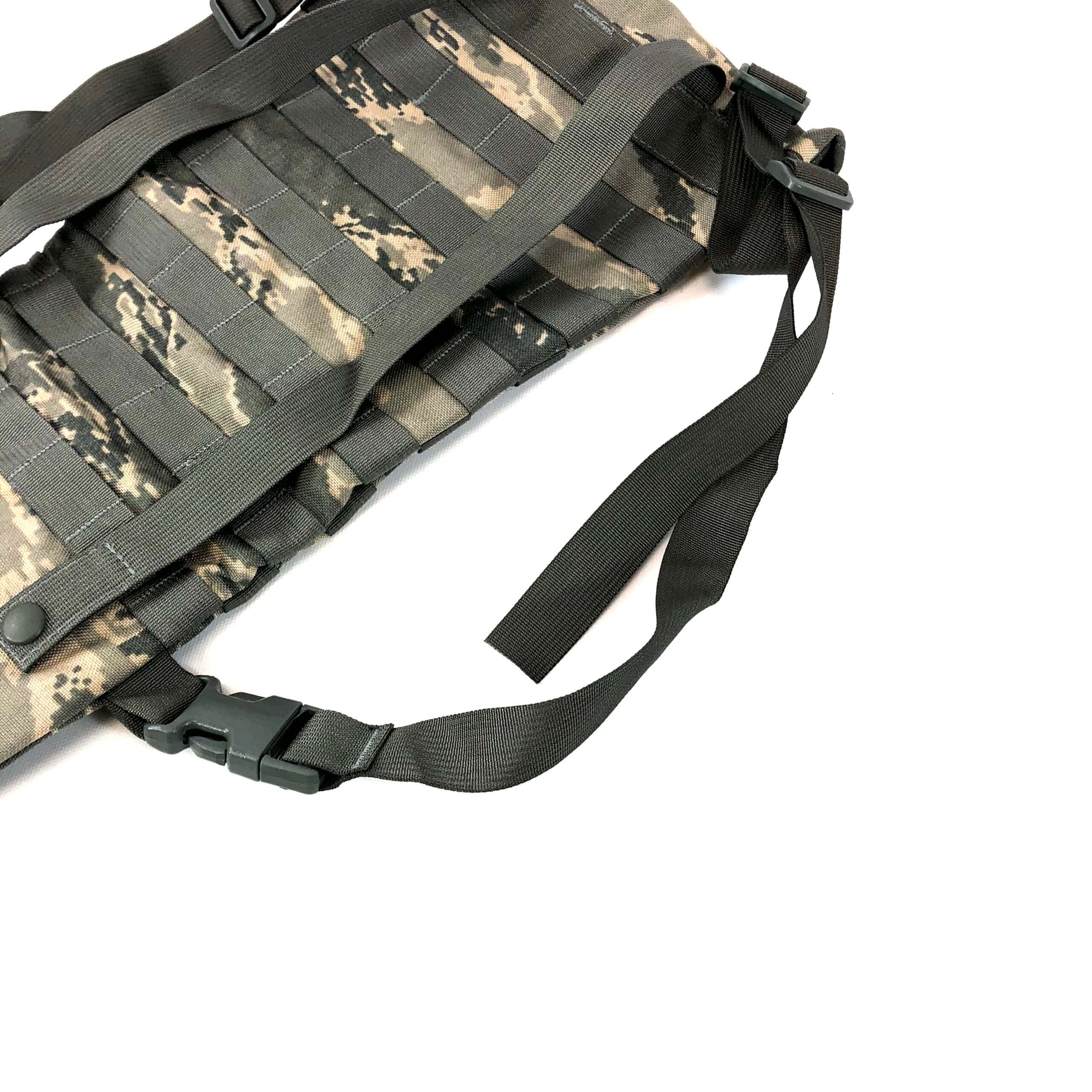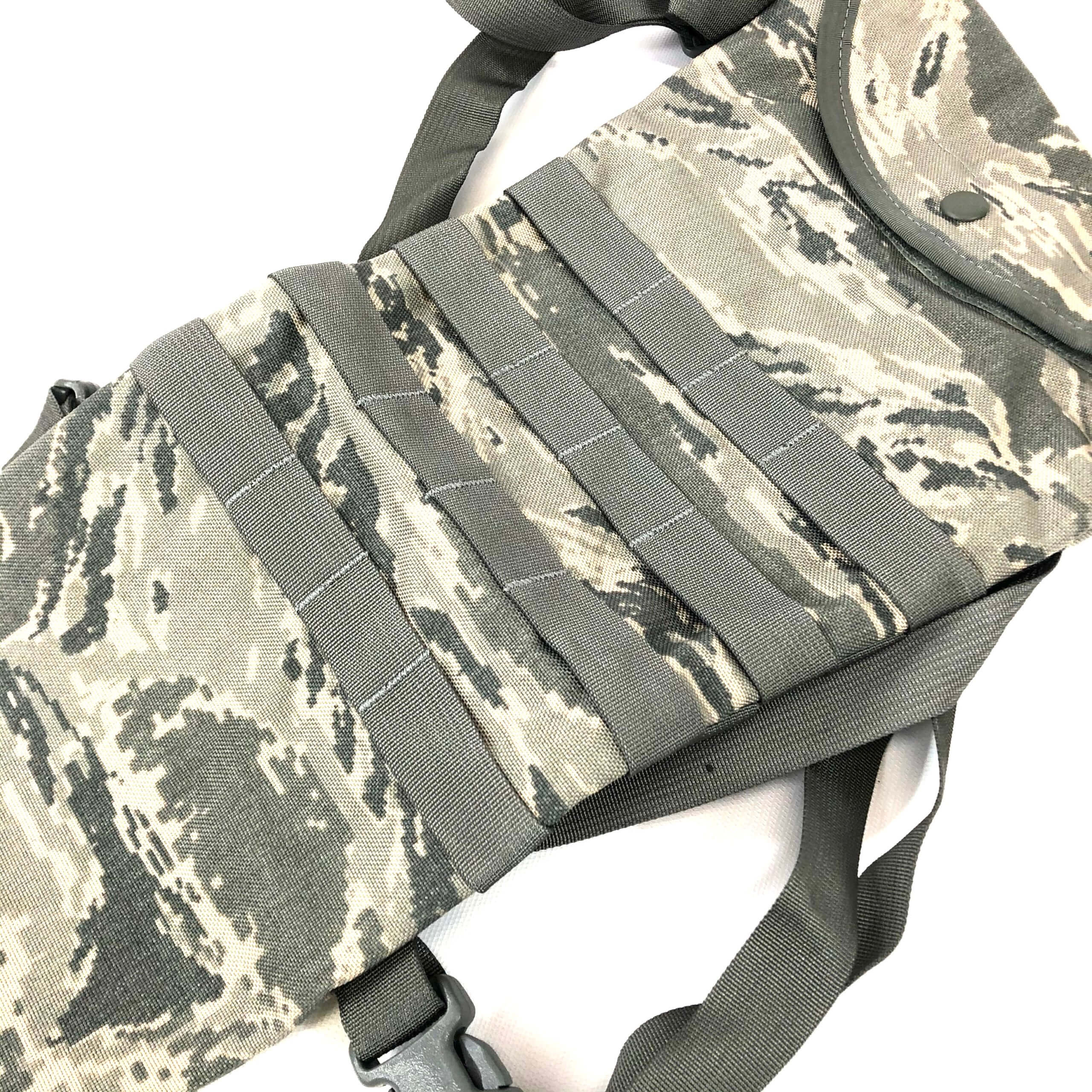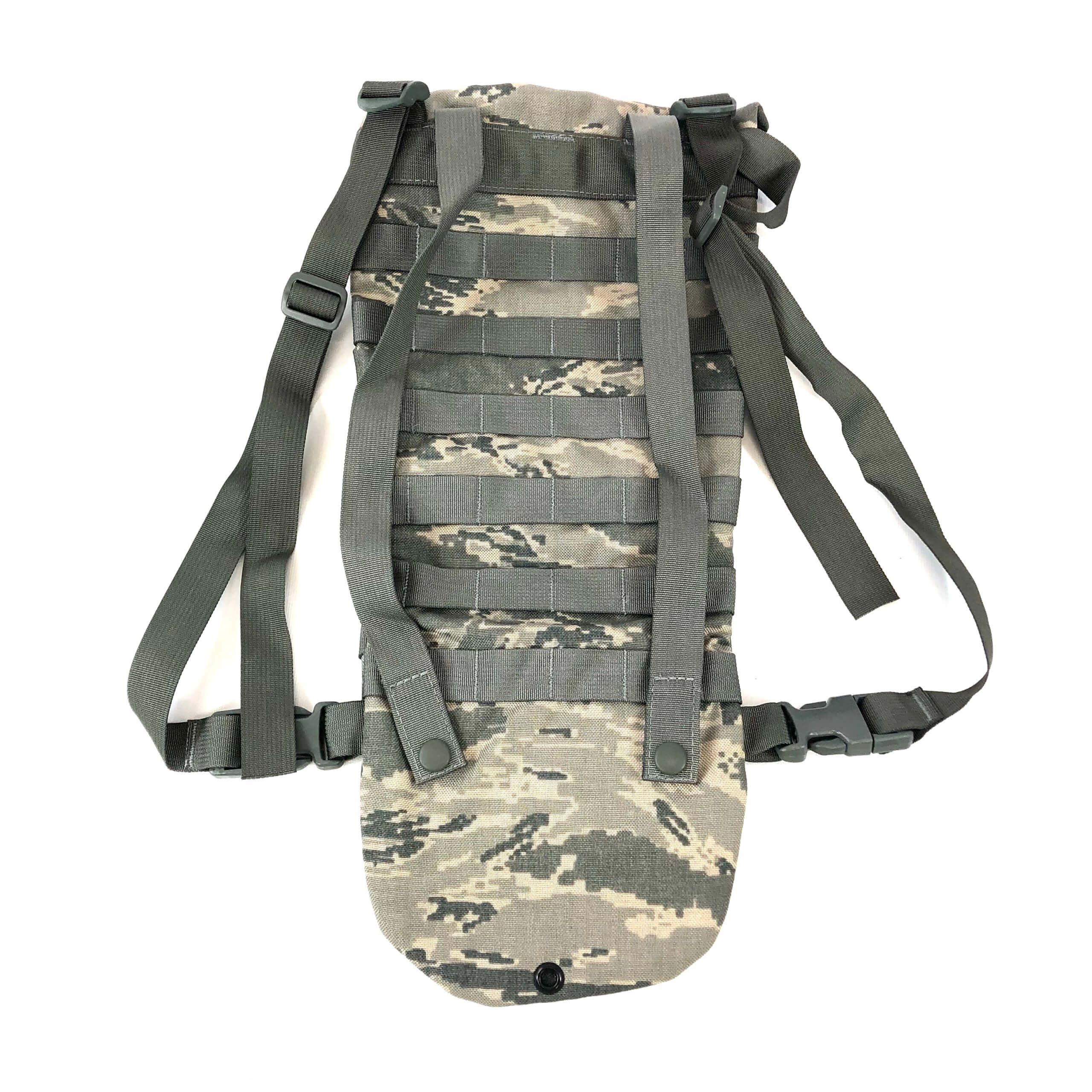 This 100 oz hydration carrier was used in the US Air Force DFLCS Kit. The hydration carrier securely holds water bladders in a sleeve. The sleeve closes with a hook and loop top and button snap strap. The carrier has a MOLLE field on the front for pouches or other accessories. Also, you can attach patches to the loop field. You can mount the carrier to any MOLLE compatible surface, as well.