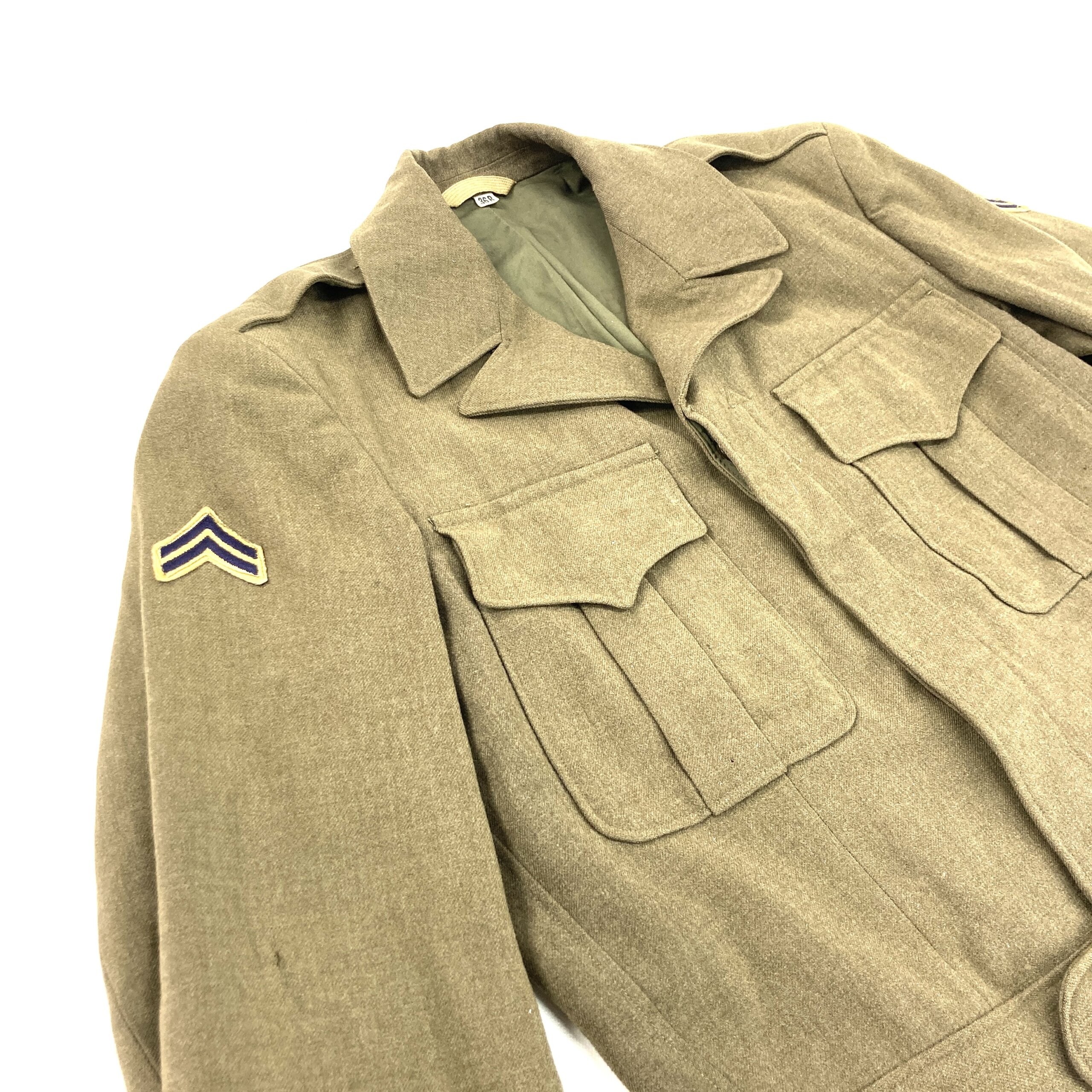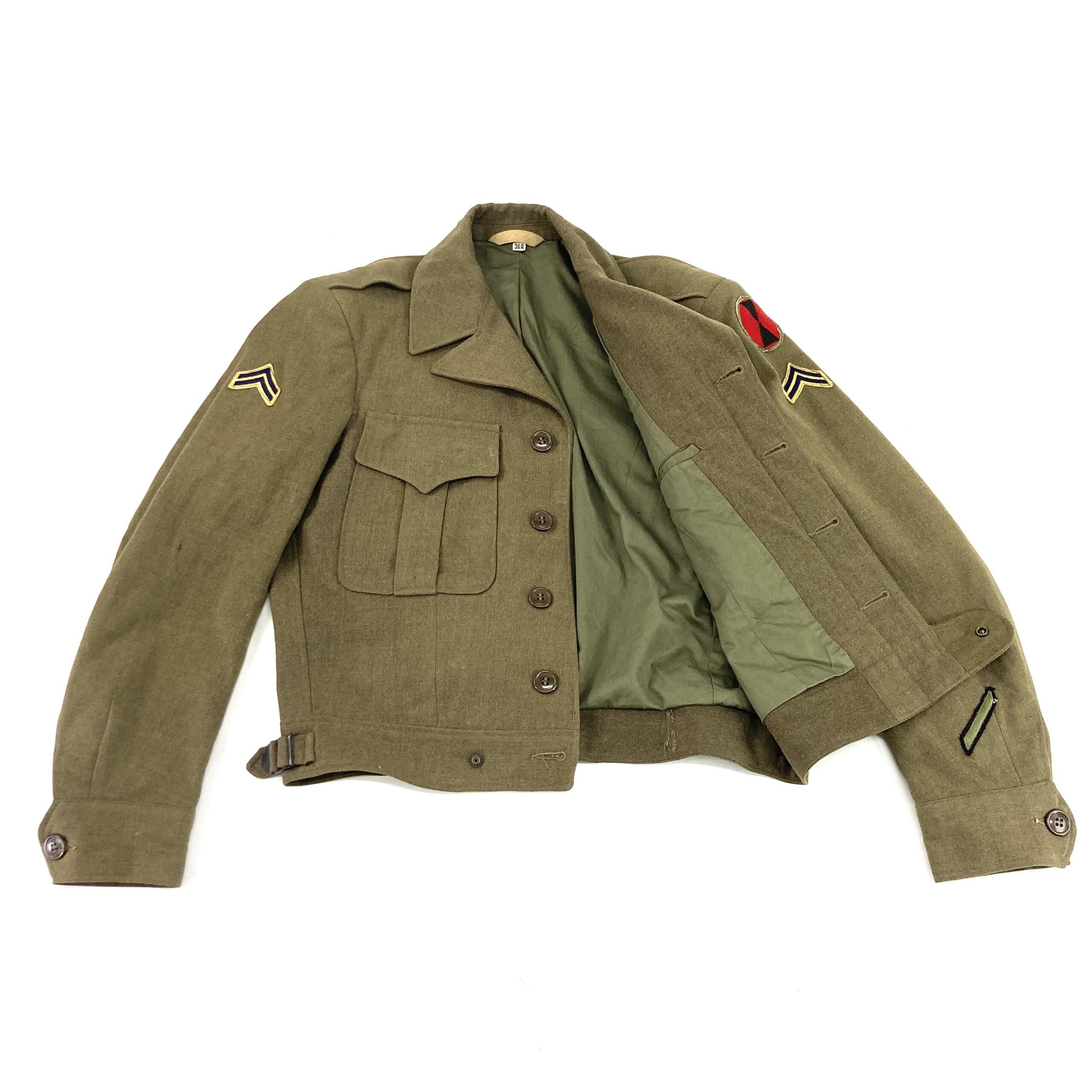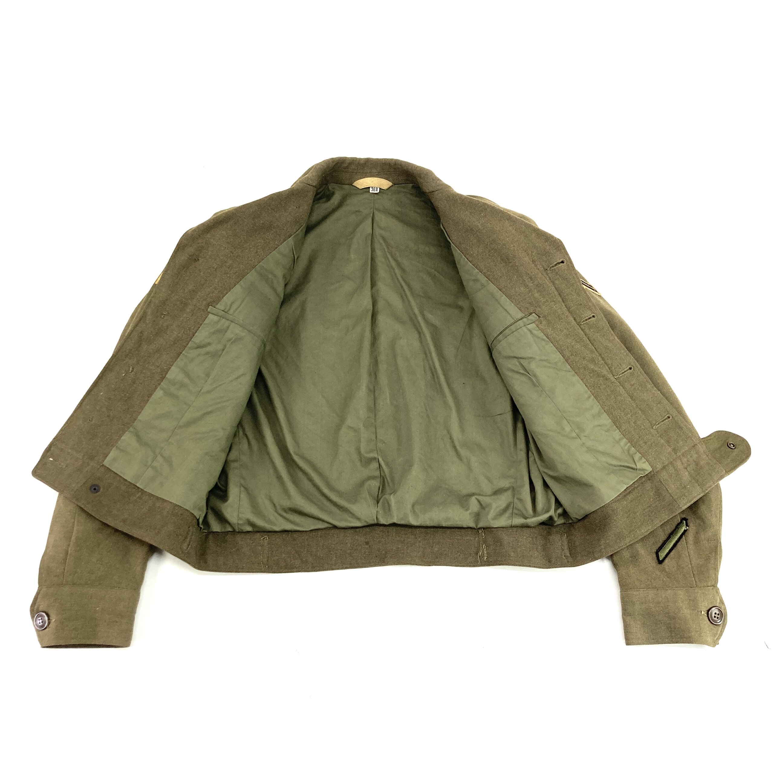 This is a Wool Field Jacket M-1944, often known as the Eisenhower Jacket or Ike Jacket. The Ike Jacket was adopted by the US Army in November of 1944. The Ike Jacket was worn as a field jacket in theater and as a dress top while in garrison, however soldiers usually saved their Ike Jackets for garrison wear rather than using it in the field.