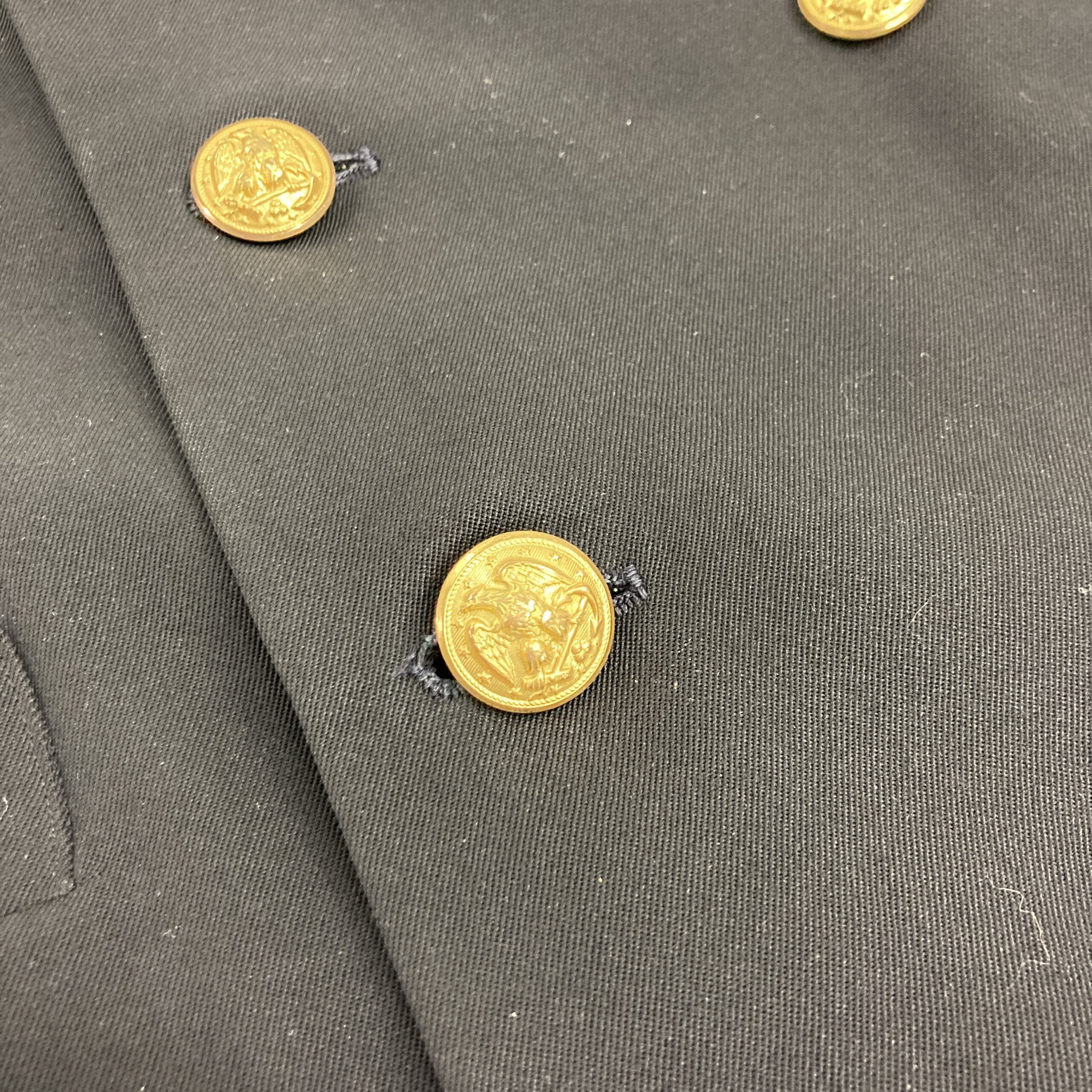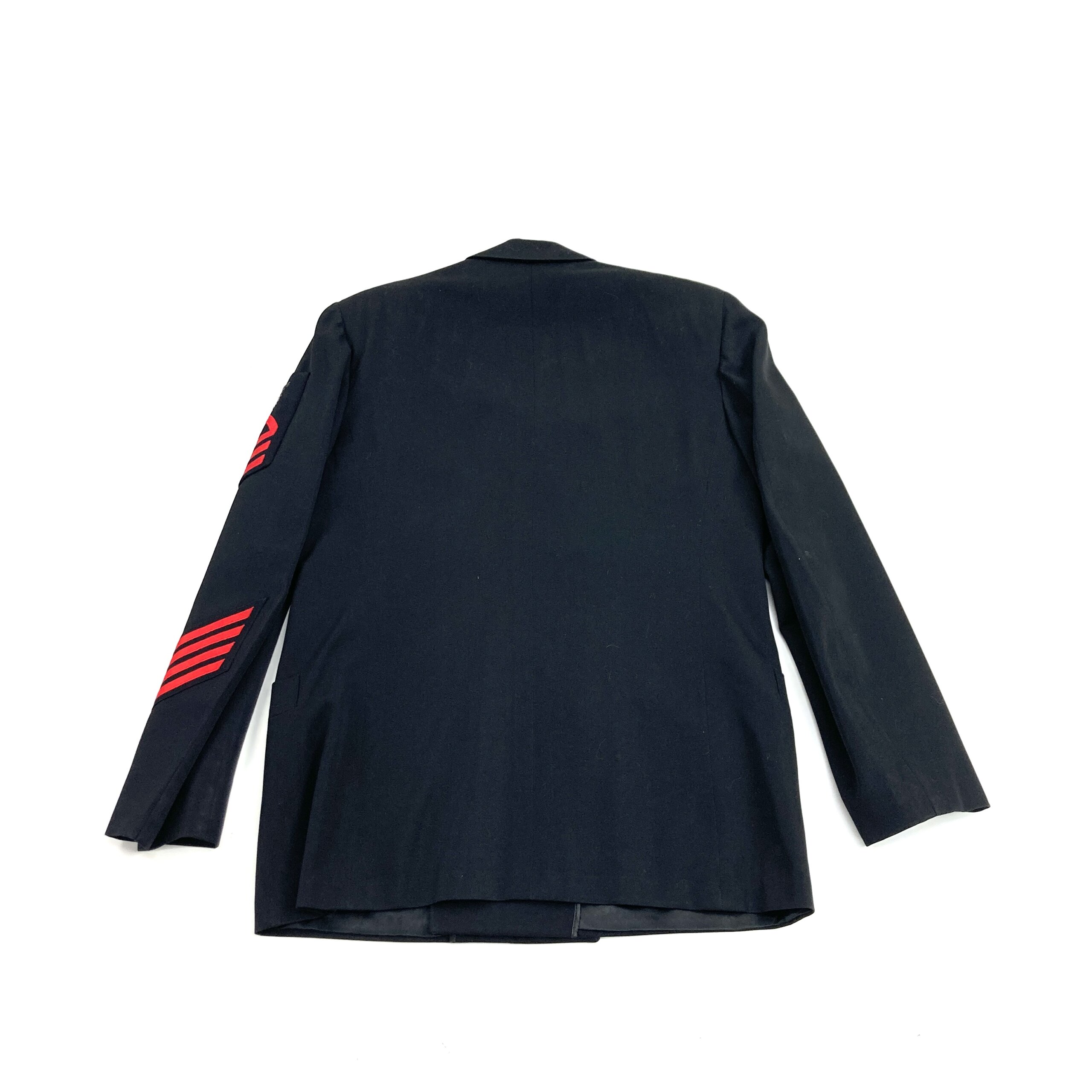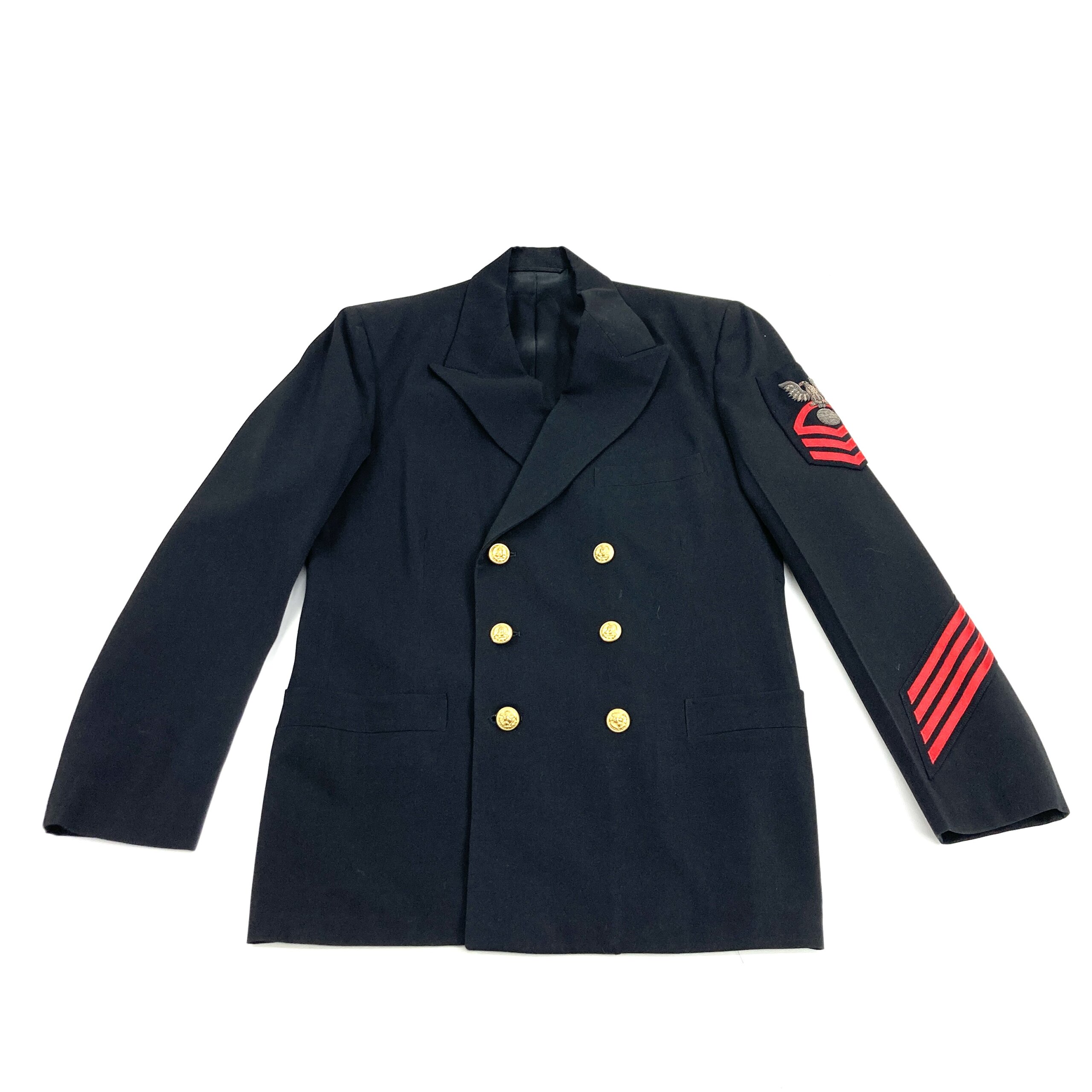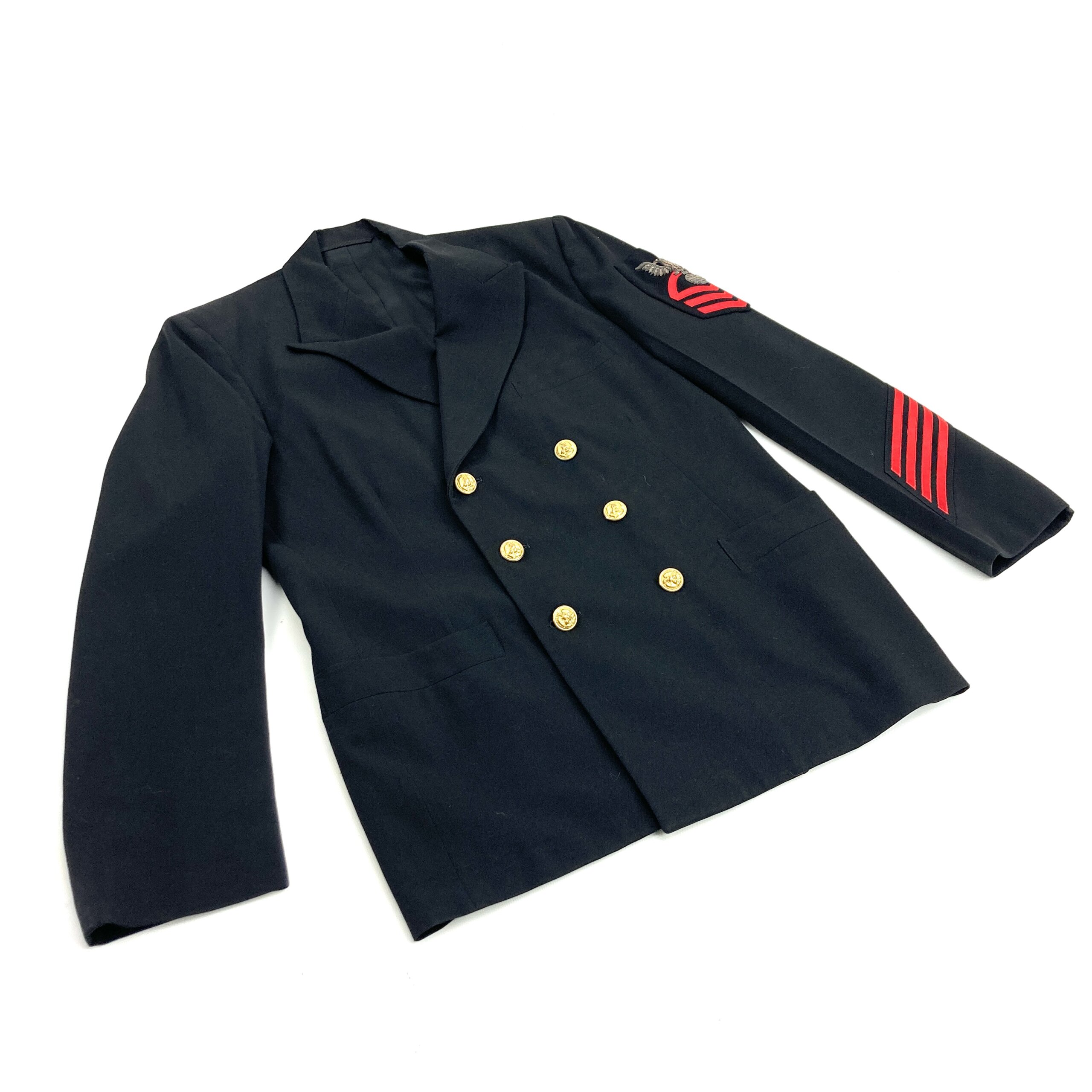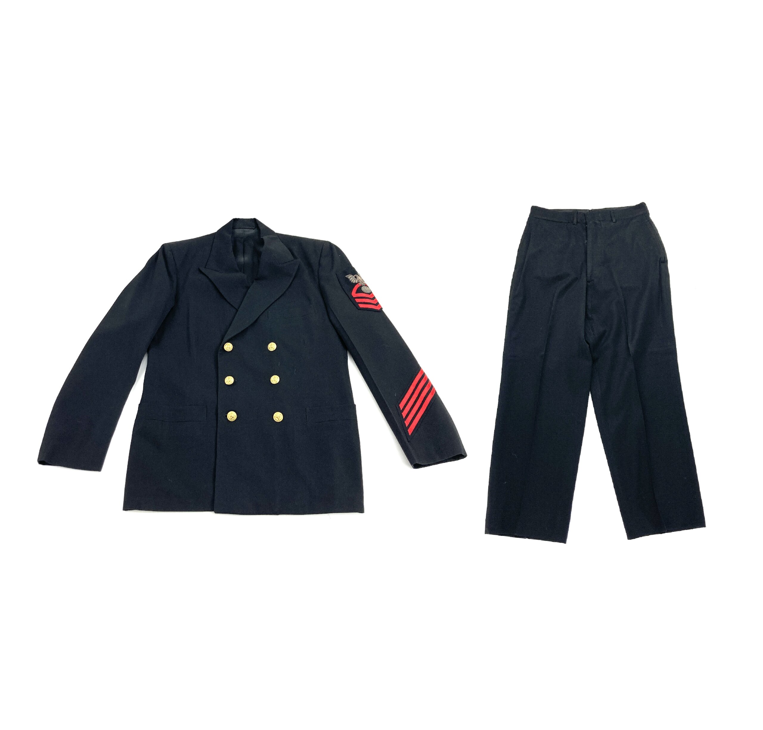 Gallery images show the exact uniform you will receive. The dress uniform is excellent condition with no rips, tears or missing buttons, however there may be light stains from long term storage and handling. The jacket is a double breasted style with 3 front pockets, 3 button jacket closure, bullion style rank patch and 4 service stripes. The pants feature dress pant style closure, 2 hand pocket, 2 back pockets, belt loops and a “change” pocket.