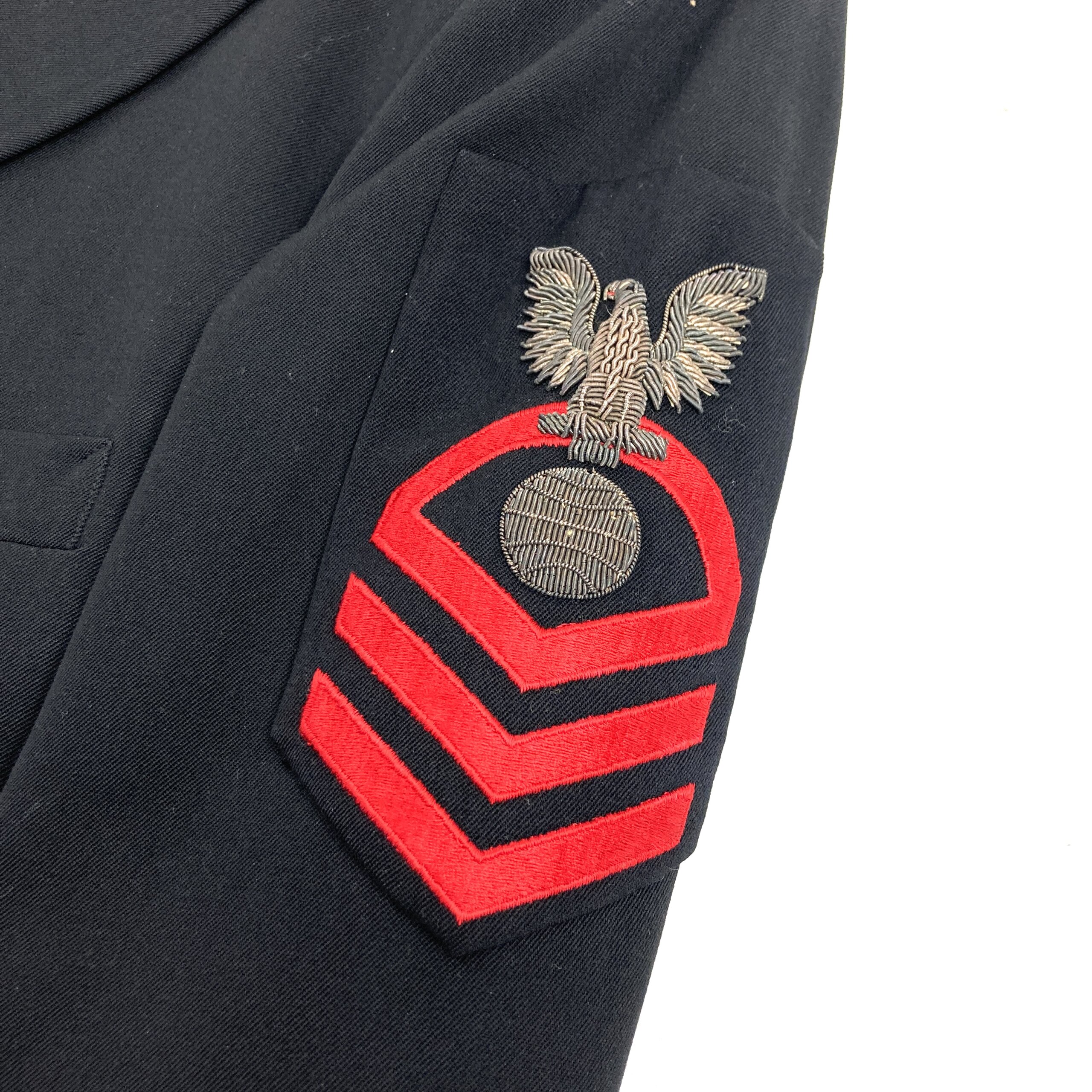 This is a Vintage US Navy Black with Red Insignia Dress uniform with Bullion Chief Petty Officer Electricians Mate Rank. This US Navy Black with Red Insignia Dress uniform would have been worn by a Chief Petty Officer who was an Electricians Mate who had 16 years of service in the Navy. The red insignia is usually present on a sailors uniform who has undergone disciplinary actions so its safe to say our CPO was a little salty during their time in US Navy service. This particular uniform would have likely been worn in the 1960s/ 1970’s, this is backed up due to the tailor who created the uniform (Esquire Naval Tailor out of Norfolk, VA) and the material content being a dracon and wool blend. So, whether you’re a dress uniform collector or someone who’s looking to relive the glory days and put together their old uniform consider adding this Vintage US Navy Black with Red Insignia Chief Petty Officer Electricians Mate Dress Uniform’s to your closet today.